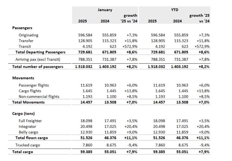 In January 2025, total cargo traffic reached 59,385 tonnes, marking an 8% growth compared to the same month in 2024. Air cargo volumes specifically saw an 11% increase, totaling 51,526 tonnes.